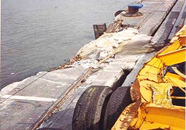 The impact caused severe damage to 22 metres of the wharf cope face and fenders, broke nine wharf deck support piles, severed wharf services and caused the total collapse of gantry container crane No 1. In its collapse, crane No 1 in turn damaged gantry container crane No 2, destroyed several containers and damaged box trailers.
