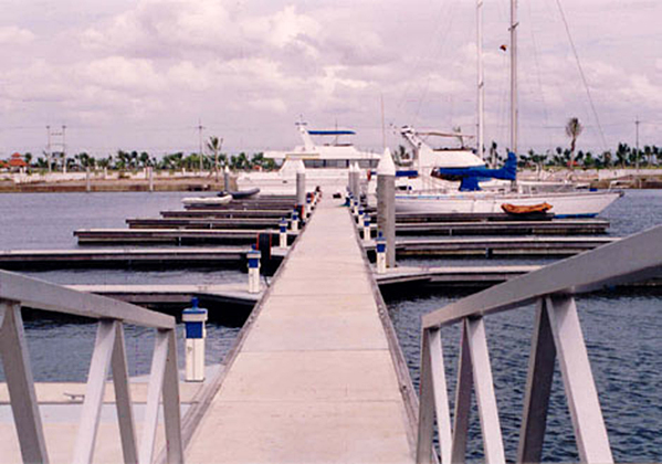 The Bangpakong River has a tidal range of 3.4m and all berths were designed as floating pontoon berths. The pontoons were designed as polystyrene encased concrete fixed with timber walers and cylindrical prestressed spun concrete piles. Access to berths is via aluminium gangways.